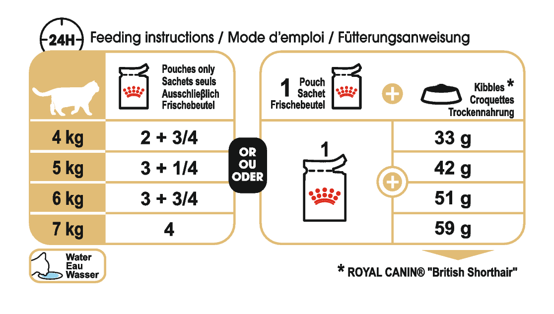 ROYAL CANIN® British Shorthair Adult torrfoder är utformad för den vuxna brittisk korthår-kattens hela näringsbehov. Kattens bastanta kroppsform stödjs genom en anpassad proteinhalt som bidrar till att katten bibehåller muskelmassa. ROYAL CANIN® British Shorthair Adult är också berikat med L-karnitin, ett näringsämne som bidrar till hälsosam förbränning av fett. Omega-3-fettsyrorna (EPA och DHA) bidrar till att främja kattens ledfunktion, så att den kan bevara sin normala rörlighet utan besvär. Dessutom bidrar den specifikt utformade balansen av mineraler i detta foder till att stödja och bibehålla din katts hälsosamma hjärtfunktion. För att tillgodose alla katters individuella preferenser finns ROYAL CANIN® British Shorthair Adult även som smakligt våtfoder bitar i sås. Om du använder blandad utfodring behöver du bara följa riktlinjerna i vår foderguide för att säkerställa att din katt får rätt mängd våt- och torrfoder för bästa möjliga hälsofördelar.