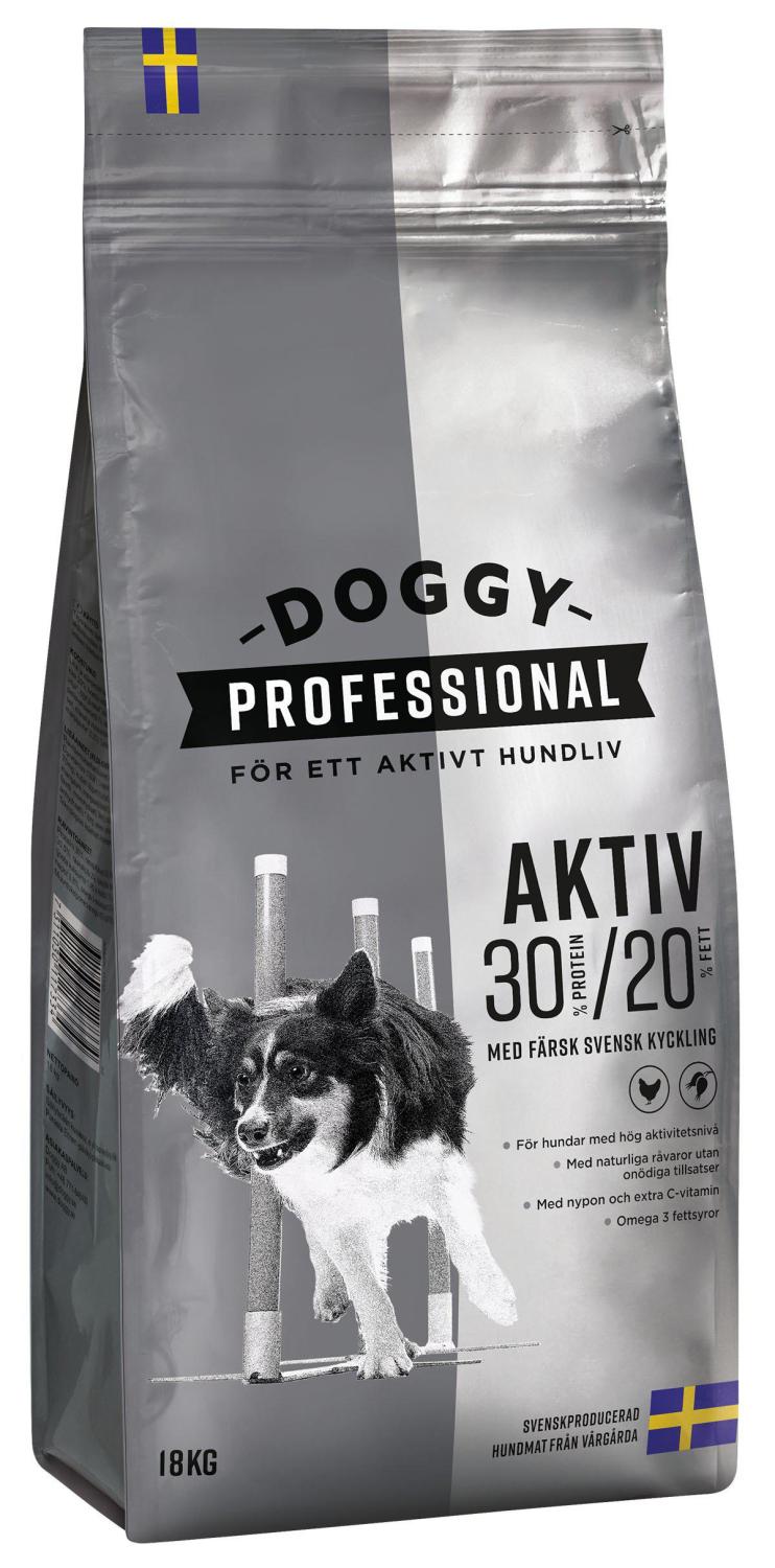Doggy Professional Aktiv är framtaget för aktiva och hårt arbetande hundar med högt energibehov, som till exempel jakthundar under högsäsong, agilityhundar eller draghundar. Det passar också för hundar som har svårt att lägga på sig och behöver gå upp i hull. Aktiv innehåller färsk svensk kyckling som är högkvalitativa protein– och fettkällor. Dessutom har vi tillsatt nypon för extra C-vitamin, något som är extra viktigt för aktiva hundar.