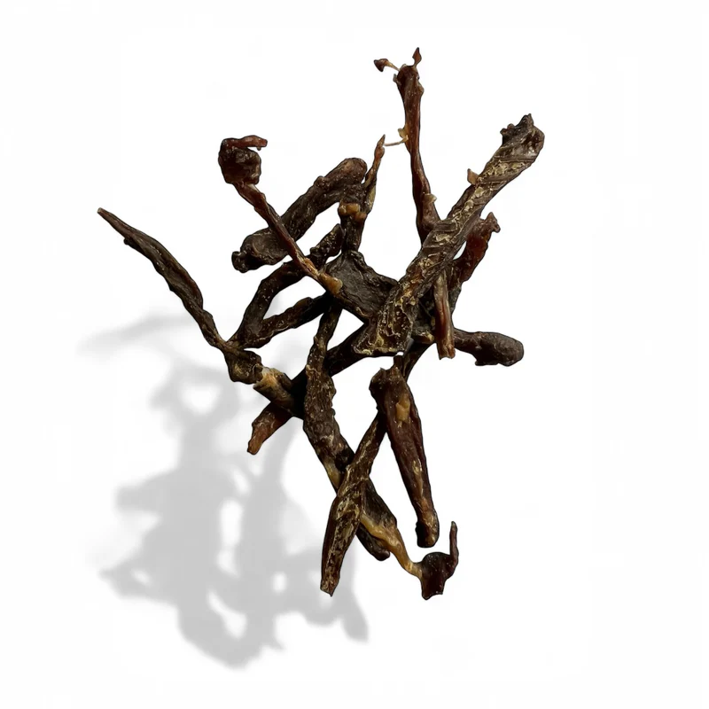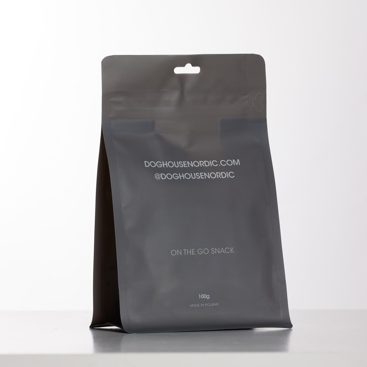 On the go snack görs uteslutande av 100% muskelkött. Tillverkad i Polen under överinseende av veterinärbesiktning. Köttet torkas med varm luft vid låga temperaturer. Torkningsprocessen säkerställer fullständig epidemiologisk säkerhet, utan användning av konserveringsmedel.