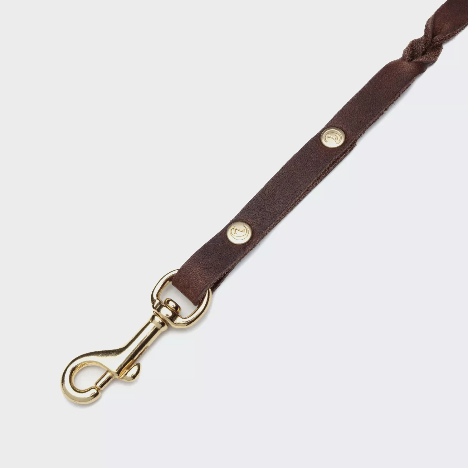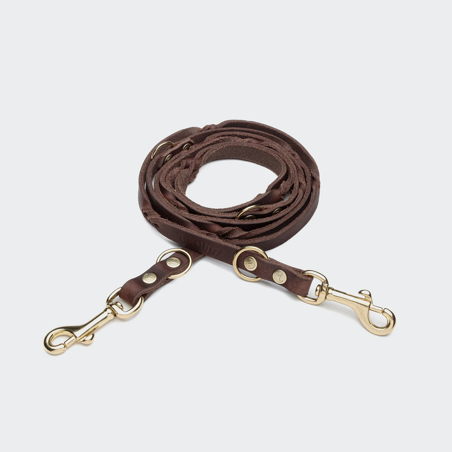 Detta justerbara hundkoppel i chokladbrunt, vegetabiliskt garvat läder är särskilt designat för små hundar. Med sin smidiga vikt, intrikata flätade detaljer och högkvalitativa beslag i äkta mässing kombinerar det både funktion och stil.