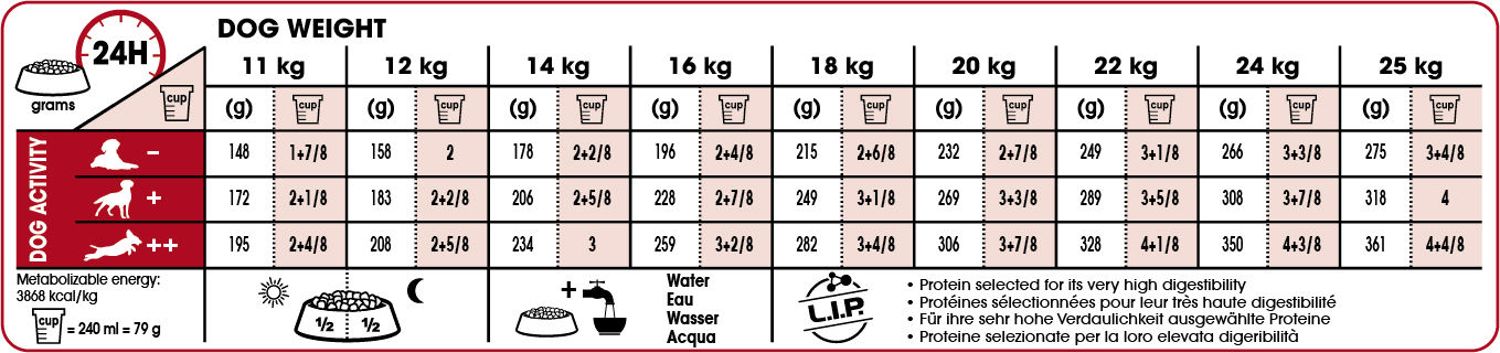 | 11 kg | 148 g (1+7/8 fodermått) | 172 g (2+1/8 fodermått) | 195 g (2+4/8 fodermått) |