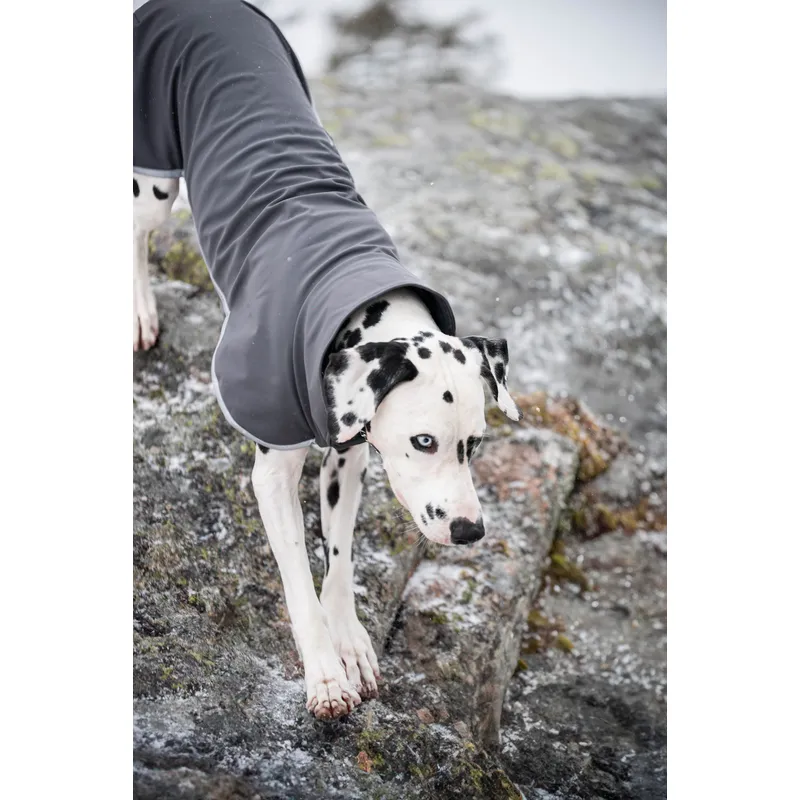 Jackan är tillverkad i ett följsamt softshell-material med trikåpartier vid krage och bröst som anpassar sig efter hundens rörelser. Den skyddar mot regn, vind, smuts och kyla, samtidigt som den andas och håller hunden torr utan att bli för varm.