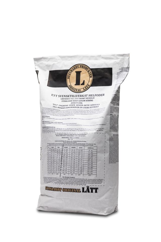 Standardt Original LÄTT är till den normalt aktiva hunden, kastrerade, överviktiga eller av andra orsaker kräver lägre fett. Standardt Original LÄTT innehåller råvaror av hög kvalitet, hög smältbarhet och med höga näringsvärden, allt som bidrar till att hålla en god hälsa genom hela livet. Hunden får mycket bra förutsättningar för en god hälsa oavsett ålder, från valp till senior. Sammansatt efter hundens biologiska upptag och evolutionära utveckling. Kanin och lamm är tillsammans de främsta animaliska råvarorna i innehållet. Kombinerat med ingredienser av hög kvalitet och näringsvärden. Helt utan onödiga tillsatser. Inga färgämnen, konservering- smakämnen eller antinutrienta ingredienser.