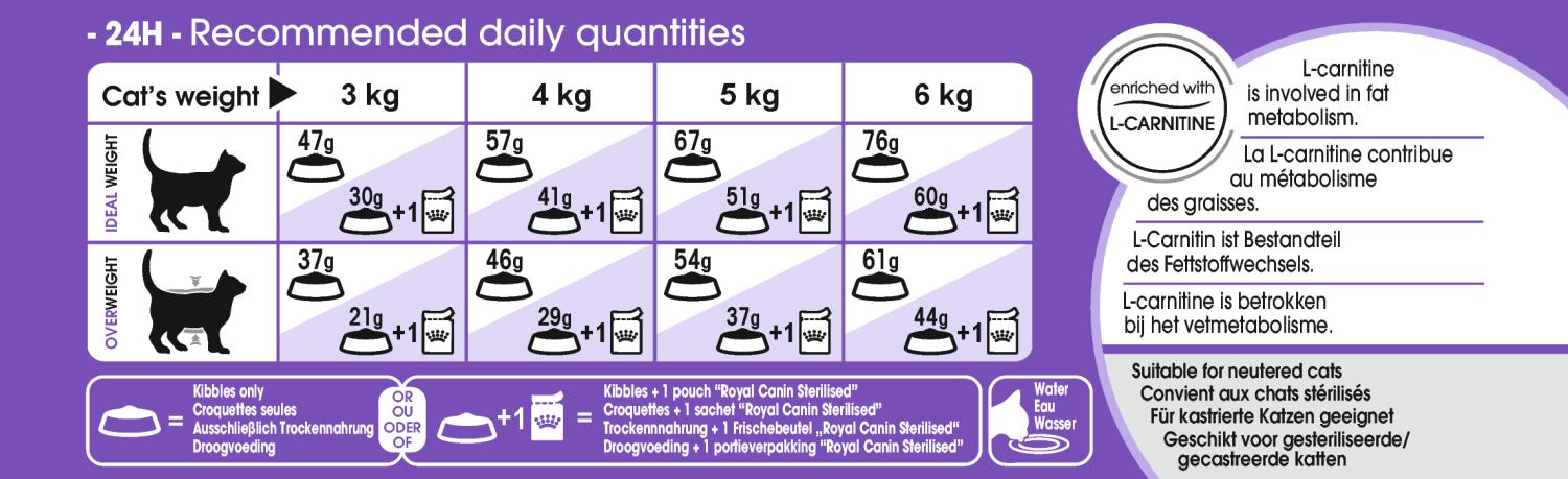 När din katt har kastrerats krävs ofta en förändrad kost för att säkerställa att fodret stödjer ett sänkt energibehov och samtidigt förser katten med de näringsämnen den behöver. ROYAL CANIN® Sterilised torrfoder för katter innehåller en måttlig fetthalt och ger du den i uppvägda anpassade dagsransoner bidrar den till en hälsosam kroppsvikt efter kastrering/sterilisering. Fodret Sterilised har också en noga avvägd balans av mineraler som bidrar till att stödja och bibehålla urinvägshälsan hos din katt, medan det förhöjda proteininnehållet i detta foder bidrar till att bibehålla din katts hälsosamma muskelmassa. För att tillgodose alla katters individuella preferenser finns ROYAL CANIN® Sterilised även som våtfoder, bitar i smakrik sås eller läcker gelé. Om du använder blandad utfodring behöver du bara följa riktlinjerna i vår foderguide för att säkerställa att din katt får rätt mängd våt- och torrfoder för bästa möjliga hälsofördelar.